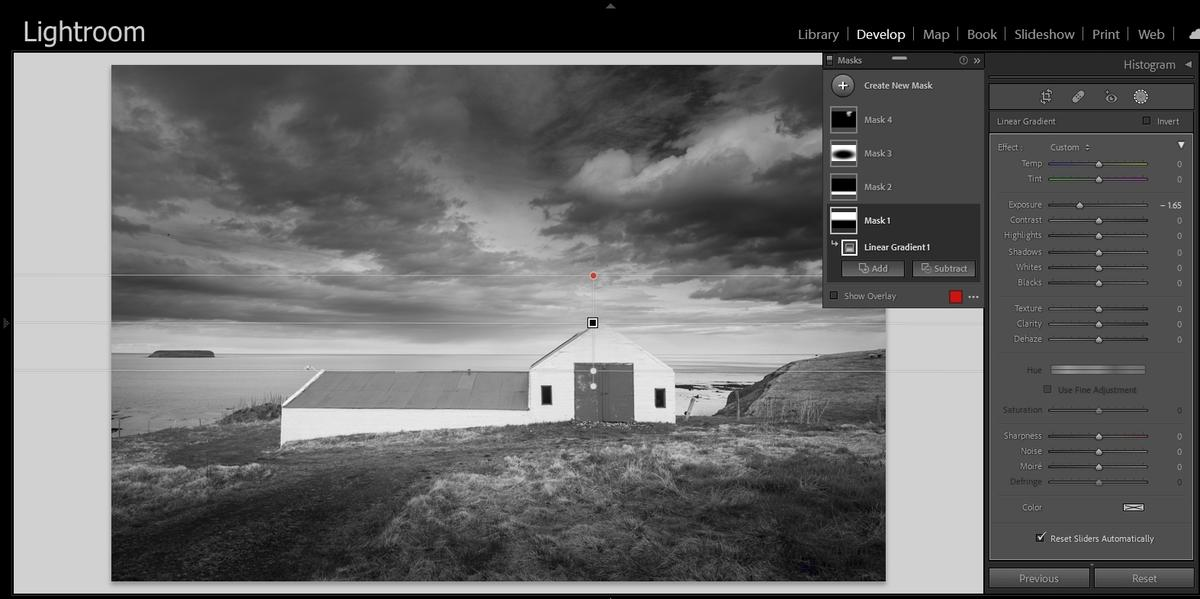 Pentru a exagera și mai mult contrastul și a scoate mai bine în evidență subiectul, cât și pentru a conduce privirea către subiect, am folosit și câteva gradiente liniare și radiale. Aici, ultima versiune de Lightroom a adus niște îmbunătățiri foarte bune, adăugând conceptul de măști, oarecum o variantă mult mai simplă decât ce oferă Photoshop, dar suficient de puternică comparativ cu ce exista in versiunile anterioare. Aș zice că e una din cele mai bune îmbunătățiri aduse programului în ultima perioadă.